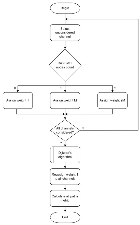 The proposed approach starts with an iterative process of assigning weight to each channel, depending on whether it is connected to a distrustful node. Channels connected to two distrustful nodes receive a weight of 2 × M, while those connected to one distrustful node receive a weight of M. Channels without connected distrustful nodes receive a weight value of 1. This process is repeated for all channels.
