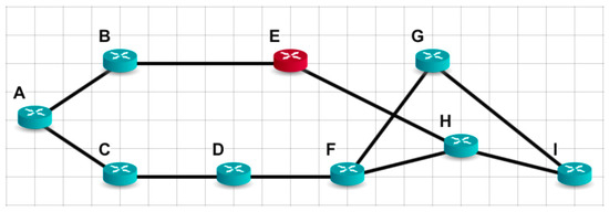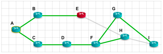 As shown in Figure 11, when using the classical algorithm, nine nodes (P, O, J, K, H, I, L, M, and N) will receive data through distrustful node E. When using the proposed algorithm, we have excellent results and there are no distrustful nodes on the path to any node. We would like to note that this is not a purely theoretical case; in real networks, there may well be topology variants with such results.