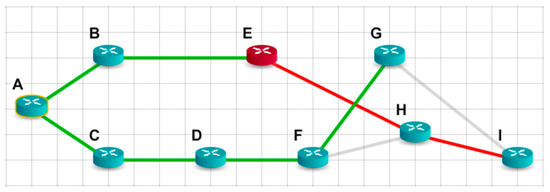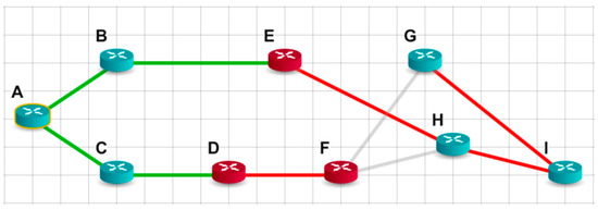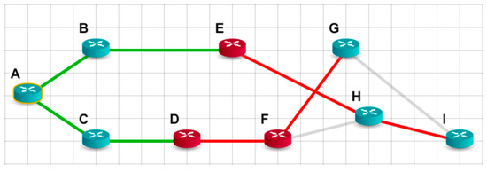 Let us choose node A as the root of the tree, that is, this node will correspond to the router whose routing table must be obtained. Figure 11a,b show the tree of shortest paths for the classic Dijkstra algorithm and the modified Dijkstra algorithm, respectively. Red shows the part of the path that the packets will travel, after they have been processed in a distrustful node.