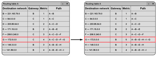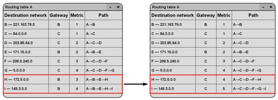 As can be seen from Figure 9, the gateway for router G has been changed from C to B. As a result, the metric and path have become longer. This change occurred because there were two distrustful nodes (D and F) on the way to node G and, after the change, there was only one distrustful node, which is E.