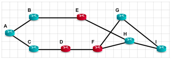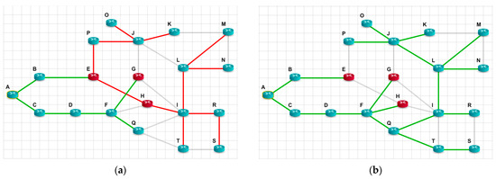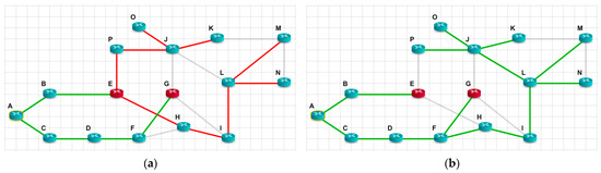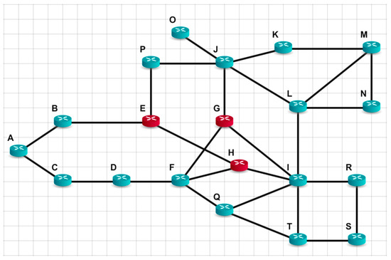 The topology of the network in Figure 13 and the location of distrustful nodes are selected in such a way as to illustrate the case of the extremely high efficiency of the proposed approach. Note that such cases can also occur in real networks. Analysis of Figure 14b shows that, when using the proposed approach, the impact of distrustful nodes E, G, and H on the security of data transmission is absent, since they will not broadcast any packets. All flows bypass these nodes. In the classical approach (Figure 14a), distrustful nodes will participate in the transport of packets up to 10 nodes (P, O, J, K, M, L, N, I, R, T, and S). Practically, only a third of the paths will not have untrusted nodes in their paths.