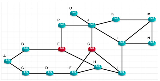 Let us extend the previous topology with an additional subnet, which includes nodes P, O, J, K, L, M, and N. Now, our network (Figure 10) has 16 nodes, two of them—E and G—are distrustful.