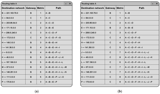 Fragments of routing tables for the network of Figure 9, according to the (a) classical Dijkstra algorithm and (b) modified Dijkstra algorithm.