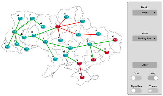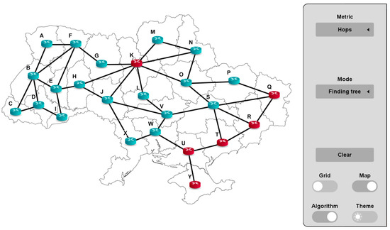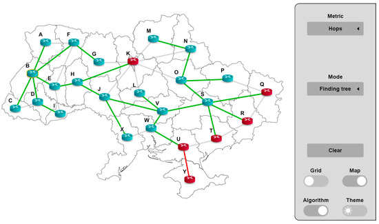 The topologies of the previous examples of networks were formed by their successive expansion and complication. In the following example, we consider a large network of arbitrary topology, the dimensions of which are chosen from the point of view of the comfortable recognition of its image. The following scenario (Figure 15) depicts the case of the presence of a distrustful node in the center of the AS and several distrustful nodes on its borders. To visually illustrate the potential possibilities of using the proposed solution, it is displayed on the background of the Ukraine map. But note that this is not an illustration of the real network. In general, it can be any Autonomous System of the Internet.