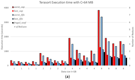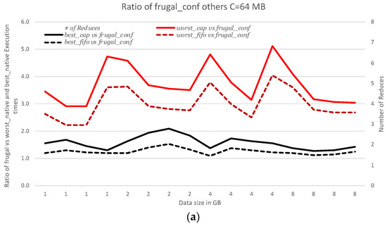 Figure 6a shows the comparison in terms of ratio of execution times, comparing frugal_conf with best_cap, worst_cap, best_fifo, and worst_fifo. The proposed frugal_conf executes on average, 270% and 62% faster than worst_cap and best_cap, respectively, for chunk size = 64 MB. frugal_conf executes, on average, 192% and 22% faster than worst_fifo and best_fifo, respectively, for chunk size = 64 MB.