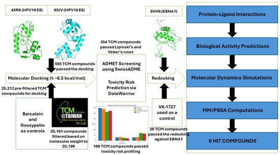 Step-by-step procedure employed in this study to identify potential small molecule inhibitors of HPV E6 and EBNA1. Compounds from traditional Chinese medicine were screened against EBNA1 and E6 proteins of HPV16 and HPV18. Top compounds were subjected to ADMET profiling and biological activity predictions. The shortlisted compounds were further subjected to molecular dynamics simulations and MM/PBSA computations to evaluate their binding affinities.