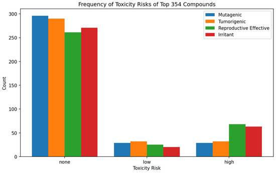 Bar plot illustrating the count of compounds categorized as “high”, “low”, or “none” for each of the four toxicity risks, including mutagenicity, tumorigenicity, reproductive effect, and irritant.