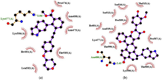 The protein–ligand interaction profiles of the various complexes were evaluated (Figure 3a,b and Figures S1–S3, and Table 3). For the EBNA1–ligand complexes, all the selected compounds were observed to interact with Lys477 and Lys586 (Figure 3a,b and Figure S1a–i). For the EBNA1–ligand complexes, residues Lys477, Asn480, Ile481, Gly484, Leu582, Thr585, Lys586, Pro587, and Thr590 were involved in most ligand interactions and are suggested to be hotspot residues (Table 3). EBNA1 inhibitor, VK-0497 was previously shown to interact with Lys477, Asn519, Lys586, and Thr590 [60]. Previous molecular docking studies also identified EBNA1 residues Lys477, Ile481, Leu582, and Lys586 as hotspot residues crucial for ligand binding [80]. Another study that screened malaria box compounds against the EBNA1 reported that Asn480, Ile481, Asn519, Leu582, Val583, Lys586, and Thr590 were involved in most ligand interactions [105].