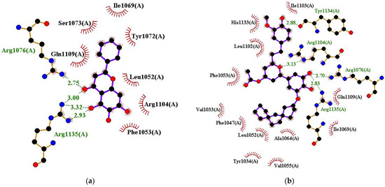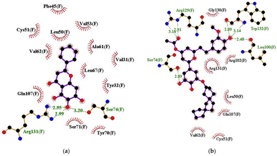 Protein–ligand interaction profile for HPV18 E6 in complex with (a) baicalein and (b) ZINC000085597263.