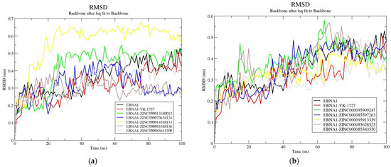 RMSD plots for the unbound EBNA1 protein and EBNA1–ligand complexes. The RMSD plots are shown for apo-EBNA1 and VK-1727 as well as (a) ZINC000013380012, ZINC000070454124, ZINC000014588133, ZINC000085568136, and ZINC000085631200 and (b) ZINC000095909247, ZINC000085597263, ZINC000095913339, ZINC000085628525, and ZINC000085543530.