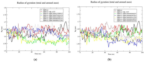 Rg plots for the unbound EBNA1 protein and EBNA1–ligand complexes. The Rg plots are shown for apo-EBNA1 and VK-1727 as well as (a) ZINC000013380012, ZINC000070454124, ZINC000014588133, ZINC000085568136, and ZINC000085631200 and (b) ZINC000095909247, ZINC000085597263, ZINC000095913339, ZINC000085628525, and ZINC000085543530.