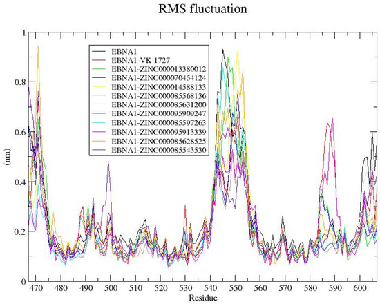 RMSF plot for the unbound EBNA1 and EBNA1–ligand complexes after 100 ns MD simulation. The unbound EBNA1 protein, EBNA1 complexed with VK-1727, ZINC000013380012, ZINC000070454124, ZINC000014588133, ZINC000085568136, ZINC000085631200, ZINC000095909247, ZINC000085597263, ZINC000095913339, ZINC000085628525, and ZINC000085543530 are colored black, red, green, blue, yellow, brown, grey, violet, cyan, magenta, orange, and indigo, respectively.