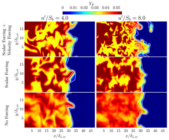 - Brearley, P.; Ahmed, U.; Chakraborty, N. Scalar forcing methodology for direct numerical simulations of turbulent stratified mixture combustion. Flow Turb. Combust. 2022, 108, 1089–1114. [Google Scholar] [CrossRef]