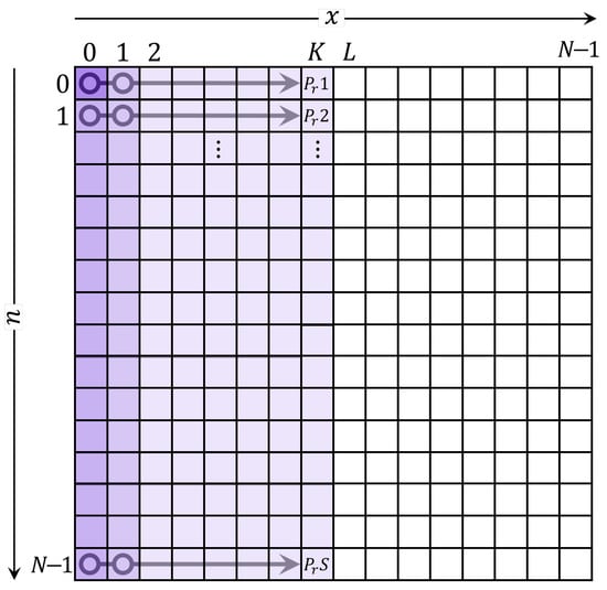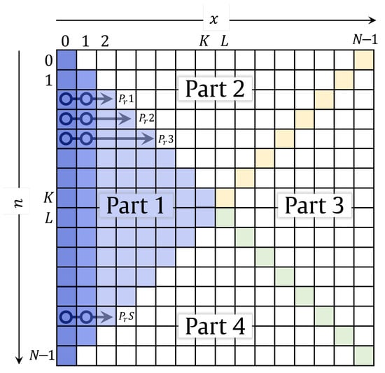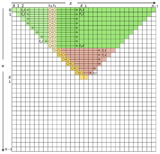 In ref. [4], the DKraP plane is partitioned into 4 parts to compute the coefficients based on a symmetry property of DKraP along the primary and secondary diagonals of the polynomial array. The proposed algorithm computes DKraP coefficients for only one part of the plane, while the coefficients of the other partitions are computed using the derived symmetry properties of the KP. Therefore, the proposed algorithm requires only recursion times, i.e., DKTv2 computes 50% less coefficients when compared to DKTv1. For more clarification, the DKraP plane and the sequential processes are shown in Figure 3. The recurrence algorithm used in DKTv2 is the same as DKTv1 (9). However, the recurrence algorithm is applied in the range , and . Then, the following recurrence relations are applied: