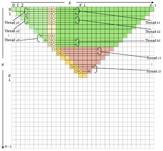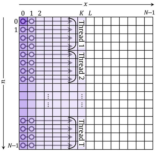 - Region 2: This region covers the range and , with the recurrence relation given by Equation (9). The recurrence relation for each n depends only on the values of and , which are independent of each other for different values of n. Thus, this region can be parallelized across multiple threads by assigning each thread a subset of the values of n.