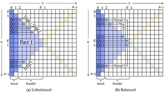 MDKTv2 represents the multi-threaded version of DKTv2. It should be noticed that when the threads are distributed over the DKraP orders, each thread will have a different number of coefficients to be computed. For example, if and threads are equal to 7, then each thread will process two orders. Thread_1 will process the coefficients at , which will run the recurrence relation three times. Thread_2 will process the coefficients at , which carries out the recurrence relation seven times. This multi-threaded version is called unbalanced multithreading and is shown in Figure 4a. Also, the pseudo code is given in pseudo code is given in Algorithm 2. On the other hand, we also presented a balanced multi-threaded version (see pseudo code in Algorithm 3), which ensures that each thread handles the same number of recurrence times, as shown in Figure 4b. For example, in the balanced multi-threaded version of DKTv2, if and threads are equal to 7, then each thread will process two orders. Thread_1 will process the coefficients at which will run the recurrence relation seven times. While Thread_2 processes the coefficients at , which also involves carrying out the recurrence relation seven times, all threads will handle the same processes of recurrence relations. It should be noted that the coefficients in other parts are computed using the similarity relation. However, when the similarity relation is used within the same thread, the coefficients in Part 3 will not be computed. Thus, to overcome this issue, the following similarity relation is also used: