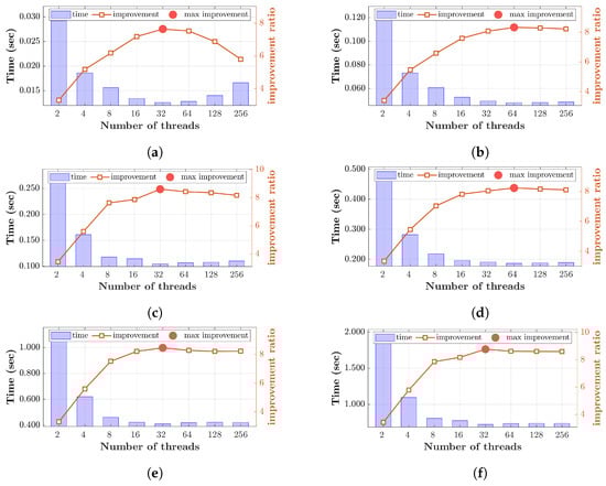 Improvement of the threaded version of DKTv3 at DKraP parameter p = 0.1 with respect to the unthreaded case for different polynomial sizes (N): (a) 1024, (b) 2048, (c) 3072, (d) 4096, (e) 6144, and (f) 8192.