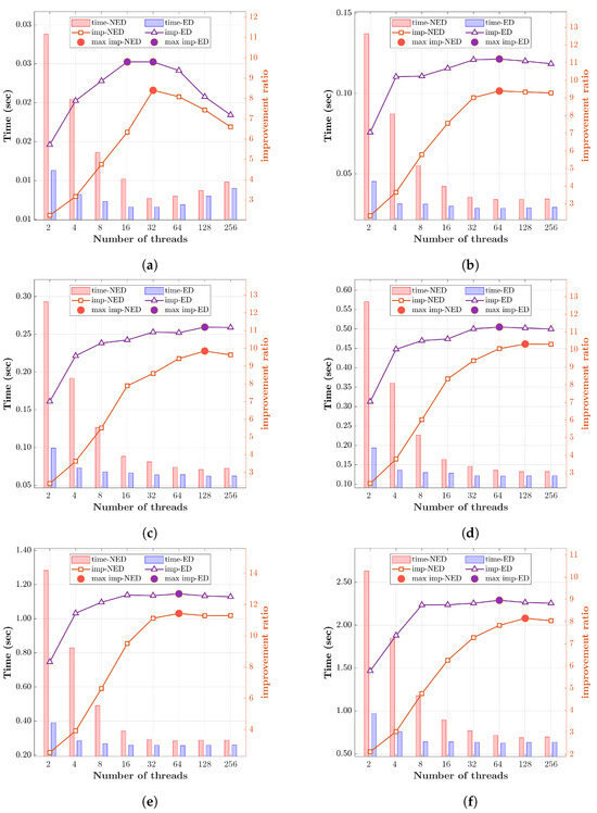 Improvement of the threaded version (for both the balanced ED and unbalanced NED versions) of DKTv2 with respect to the unthreaded case for different polynomial sizes (N): (a) 1024, (b) 2048, (c) 3072, (d) 4096, (e) 6144, and (f) 8192.