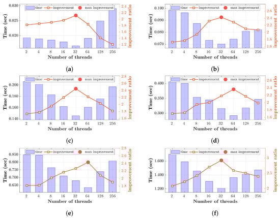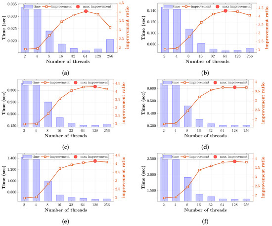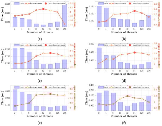 Improvement of the threaded version of DKTv1 with respect to the unthreaded case for different polynomial sizes (N): (a) 1024, (b) 2048, (c) 3072, (d) 4096, (e) 6144, and (f) 8192.
