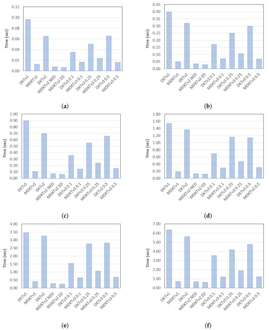 Figure 12 shows all the delays of the three unthreaded algorithms and their optimal timings in the threaded versions. Among the unthreaded algorithms, the third algorithm, namely DKTv3 with p = 0.1, has the lowest timing. Despite this, when threading is applied to the algorithms, the equally distributed version of the second algorithm, MDKTv2 ED, achieves the lowest timing in all the considered order sizes. The latter achieves a timing reduction of 13% to 48% with respect to the threaded version of the first algorithm, MDKTv1. Similarly, it reduces the processing time as compared to the threaded version of the third algorithm, from a minimum of 48% to a maximum of 60%, from 67% to 76%, and from 49% to 62%, at p = 0.1, 0.25, and 0.5, respectively.