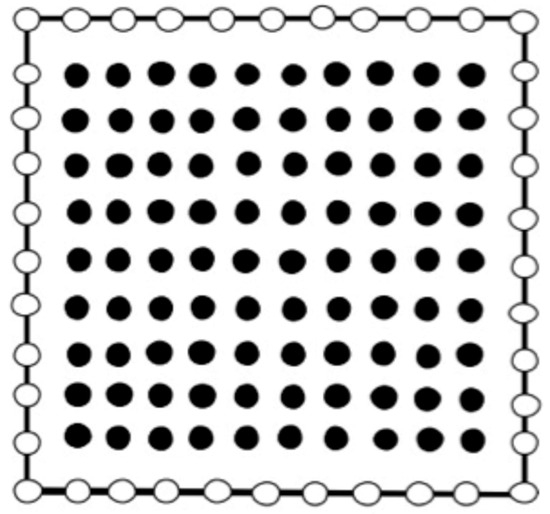 This study considered the generalized radial basis functions and with the anisotropy constant of magnetite nanoparticles given in [33] and the following parameters: , , and . This study considered the computational domain, which has 40 boundary nodes and 90 internal nodes as illustrated in Figure 2.