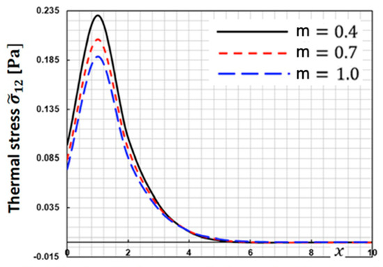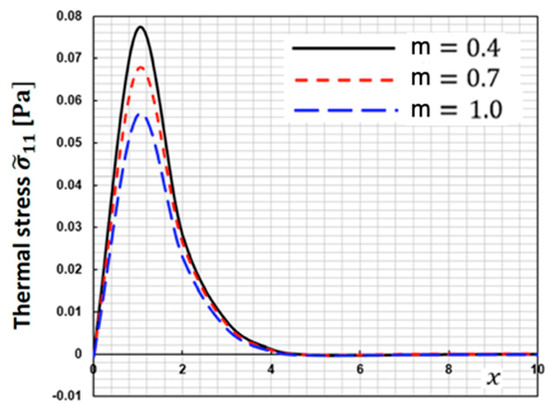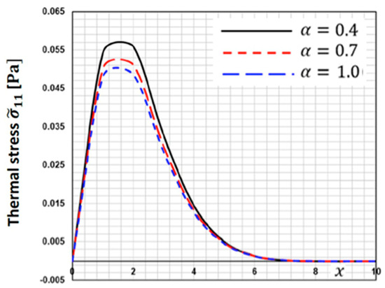 Figure 6 depicts the fluctuation of thermal stress along the -axis for various fractional order parameters . This figure demonstrates that when the functionally graded parameter increases, the thermal stress decreases.