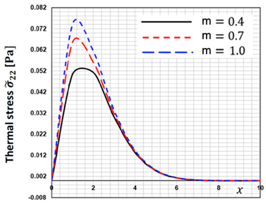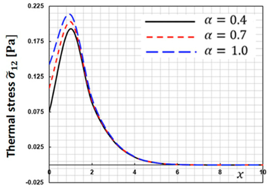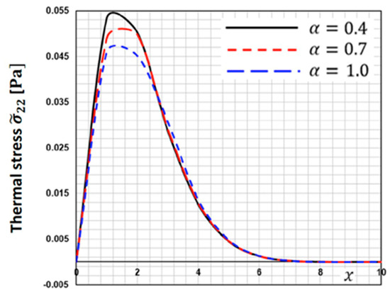 Figure 8 depicts the fluctuation of thermal stress along the -axis for various fractional order parameters . This figure demonstrates that when the functionally graded parameter increases, the thermal stress increases.