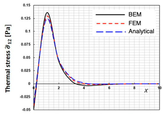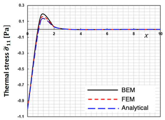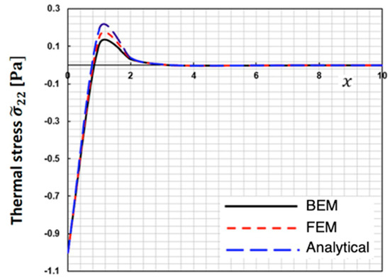 Figure 9, Figure 10 and Figure 11 display the change in special case thermal stresses , and along the x-axis for the suggested BEM, finite element method (FEM) of Sidhardh et al. [36], and analytical (Analytical) solution of Kumar and Mukhopadhyay [37], which are some special cases of our study. These figures show that the BEM results of the proposed technique match well with the FEM and Analytical results, validating the technique’s validity and accuracy.