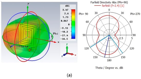 Figure 10 shows the results of the numerical simulation for the reflection coefficient at the antenna driving point, plotted versus the frequency. Some dips (quasi-resonant frequencies) with about 7 dB or better are observed in the region between 2.2 and 6 GHz. The dip frequencies, besides 2.4 and 5.9 GHz, are approximately 3.2 GHz, 3.9 GHz, 4.4 GHz, 4.7 GHz, and 5.2 GHz. The dips’ position and depth depend on several design parameters, including (spacing), (width) and (thickness of copper). Some simulation results for the frequencies of 2.4 GHz and 5.8 GHz are summarized in Table 3, including the antenna’s maximum directivity (3.47 dBi and 4.18 dBi, respectively). Detailed far-field results and polar patterns are shown in Figure 11a,b. For both frequencies of interest, the antenna radiation pattern is quite broad. At 2.4 GHz (Figure 11a), it comprises two almost symmetric wide lobes around the z-axis in the plane. At 5.8 GHz (Figure 11b), a frontal lobe and a somewhat smaller backward lobe are observed around the x-axis.