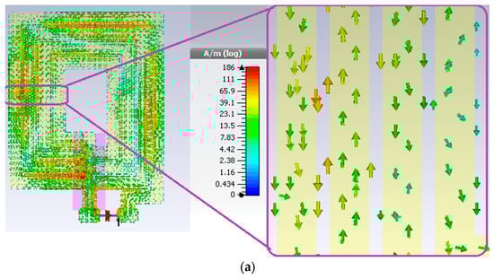 Snapshots of simulated surface currents at 2.4 GHz and 5.8 GHz are shown in Figure 12a,b, respectively. Also, the coupling effect is visualized in the additional detail view of Figure 12a. In the case of 2.4 GHz (Figure 12a), a maximum surface current value is observed along the two outer lines of the spiral, while on the inner lines, the surface current is up to approximately half the maximum value. A smooth overall current distribution is observed. As shown in Figure 12b, the surface currents for 5.8 GHz are smaller due to a higher operating frequency.