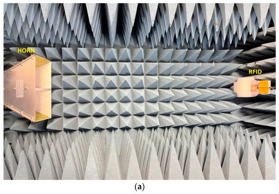 The reflection coefficient and gain of the fabricated RFID antenna were measured with a PicoVNA 106 Vector Network Analyzer (VNA) over the instrument’s frequency range of up to 6 GHz. To this end, an SMA connector was attached (as shown in Figure 13b) to the input pads of the RFID antenna via a small piece (10 cm approx.) of 50 ohm RG400 coaxial cable. The SMA input port thus obtained was connected to the VNA port 1 test lead to measure the reflection coefficient . The transmission coefficient was subsequently measured by connecting a wideband dual-ridged TEM horn antenna (Vector Telecom Part No VT10180DRHA10SK) to the second VNA port test lead (Figure 14a). The horn antenna was rated, according to specifications, at a maximum VSWR of 2.5 and an average gain of 10 dB over the 1–18 GHz frequency range. Calibration of the VNA was carried out by the standard SOLT method at the test leads, using its accompanying mechanical calibration kit (furnished by the manufacturer). The measurement of was repeated for two identical horn antennas, connected to the same VNA test leads (Figure 14b). In all cases, the antennas were placed inside an anechoic enclosure with dimensions of about . For mechanical support, expanded polystyrene was used to minimize the multiple scattering effects inside the enclosure.