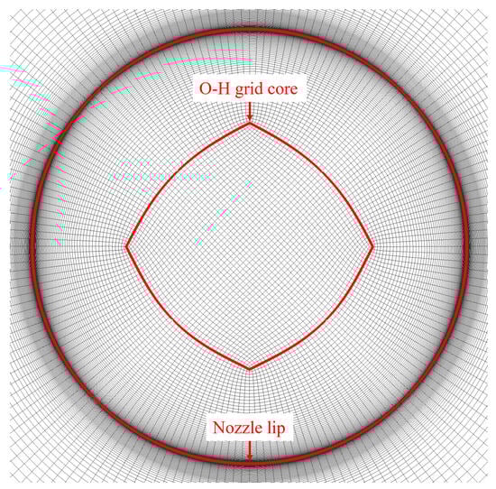 The resulting OH-grid, as shown in Figure 3, offers several benefits. First, it creates consistently high-quality cells near the walls that enable the precise matching of the circular nozzle. This match is crucial for the accurate capturing of the boundary layer phenomena and flow interactions. Moreover, the OH-grid facilitates smooth gradient transitions from the near-wall region towards the jet core and further into the far-field. This seamless transition is essential for maintaining numerical stability and resolving flow features across the entire computational domain.