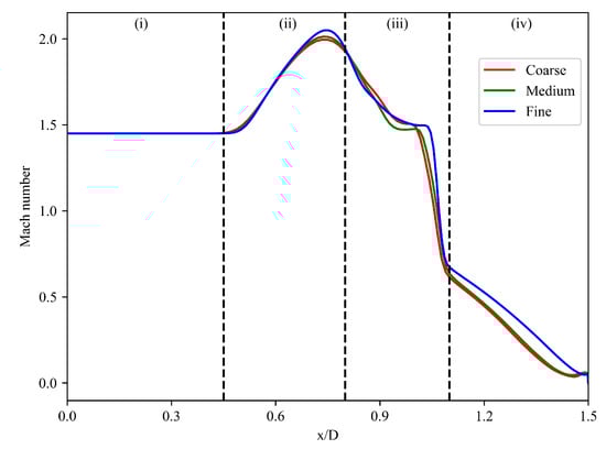- In the second segment, all cases exhibit a peak Mach number of approximately 2 at around . More specifically, between the medium and fine cases, the deviations in peak Mach number and its location are both approximately 2%, which are marginally smaller than the 3% and 2% differences in peak Mach number and its location, respectively, between the coarse and fine cases.