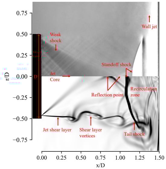 Comparison of instantaneous (top) experimental and (bottom) numerical schlieren images for a similar SIJ configuration, reproduced from experiments carried out in Reference [34], while the simulation result is generated by the medium resolution mesh. D is the nozzle diameter of .