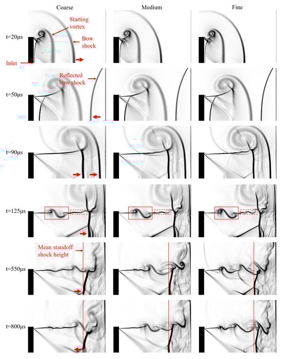 All three cases display almost identical results at the start of the simulation (i.e., ), particularly before the bow shock from the supersonic starting jet is reflected off the wall and interacts with the starting vortex ring. However, as the reflected bow shock approaches the nozzle lip at approximately , differences in the jet shear layer become apparent, with small but noticeable shear instabilities being observed in the fine and medium cases, while the coarse case still appears mostly unperturbed. After the bow shock impacts the nozzle lip, shear instabilities are instantly amplified and, at the earlier stage like , larger-scale vortices (enclosed by solid box) are resolved similarly by all three cases, but the intensity of smaller-scale instabilities (highlighted by dashed box) clearly increases with mesh resolution. The differences in these transient features compound over time such that for , as the flow has settled into a quasi-steady state, even the major unsteady flow features begin to deviate across the three cases, including the large-scale shear-layer vortices and standoff shock location (relative to the mean standoff shock height indicated by the red vertical line). Hence, the equivalence of the three meshes is only true statistically wherein any temporal dependence will be eliminated by time-averaging, an effect that is supported by the comparison of RANS and LES of SIJs by Chan et al. [15]. In turn, mean results will tend to require less mesh resolution to be captured, which is the main contributing factor to the typically lower computational cost of RANS simulations than that of URANS and LES.
