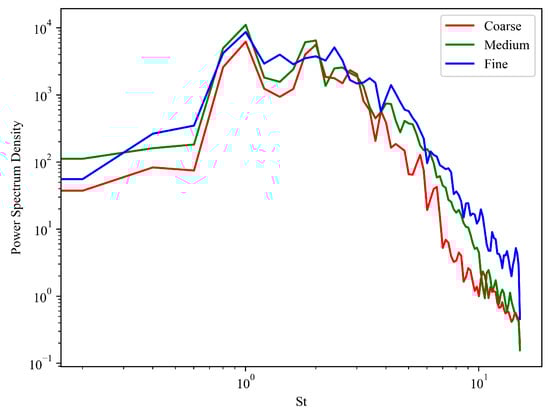 Notably, the primary peak of all three cases occurs at a similar Strouhal number , indicating that the largest transient features are well captured by all three levels of mesh resolutions. However, in general, as the mesh resolution increases, the energy is higher and dissipates at a slower rate, suggesting that more fine-scale structures are resolved by the increased mesh resolution, a differentiation that is especially clear for the fine mesh, as seen in Figure 6. Likely due to these differences in the smaller-scale transient features, the cascading interactions from the large to the small scale and backscattering from the small to the large scale deviate between the coarser cases and the fine case, resulting in a slight shift in the second peak of the fine mesh to , such that the coarse and medium meshes agree better at . This deviation is not statistically significant since all three meshes were found to be adequate for time-averaged properties in Section 3.1. Overall, the coarse mesh displays significant deviations from the medium and fine cases in terms of the power magnitude, even at the lower frequencies, with the deviations increasing as increases. In contrast, the medium- and fine-mesh results agree reasonably well until the higher range of , where the energy of the medium case decays more rapidly than that of the fine case.