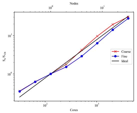 Notably, both cases even exhibit better-than-ideal scaling performance in the 32- and 64-core runs, which is likely due to the additional cache and memory allocation from the MPI threads constraint. The superior performance of the coarse case between the 512- and 2048-core runs (4 and 16 nodes) suggests an optimal cache usage per thread for the current OpenFOAM framework under the given workload of the coarse case [45].