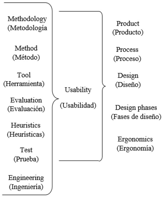 A literature review was conducted to select proposals focused on usability. The words used were chosen from a search through the Science Direct, Springer, and EBSCO databases as well as from related documents shown by the Google Scholar search engine. Figure 2 shows the usability-related keywords, which were used in both English and Spanish.