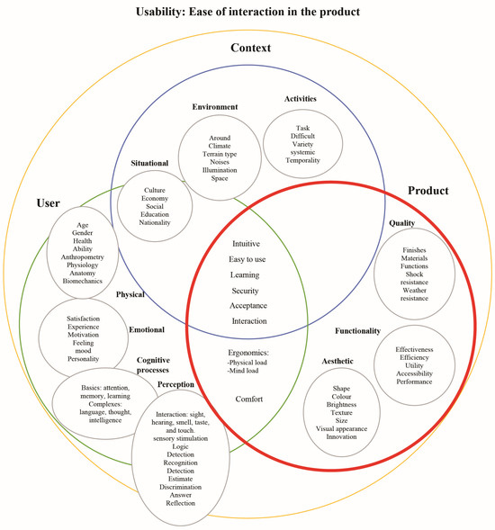 It is important to note that the literature review led to the detection of a universe of attributes that different authors have classified as relevant to usability. The current project’s goal was to carefully consider all potential attributes to ensure that no characteristic related to usability was overlooked. It was decided to rely on experts and users to evaluate the attributes based on the specific product type. To minimize deviation in expert opinions, it was recommended to involve three to five experts from Nielsen and Landauer [38]. Furthermore, paired comparisons in AHP have proven to be an effective method for assigning hierarchical weights across multiple criteria. Performing these comparisons in a fuzzy environment helps reduce subjective opinions and supports experts in making informed decisions. Afterward, it was found very useful to classify the attributes in three approaches directed to the product, the context, and the users, where Calvo, Ortega, and Saez mention that, to generate and discover a better design, it is necessary to know how users work, how they manipulate it, and how they perform the tasks for which the product was designed. Therefore, there is only usability with the user; there is usability with context and much less without the product itself [41]. Of course, we cannot change the characteristics of people nor those of the context, so the present proposal focused on working with a grouping of 26 product characteristics sub-classified into aesthetic, quality, and functionality attributes. It should be noted that nine of these attributes were closely related (Figure 3) through an intersection with the context and people, which, according to Nielsen, are the relevant points to develop a good design [36].