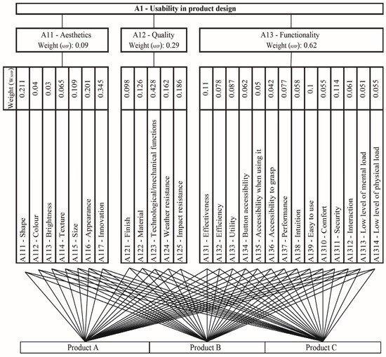 The value of the present proposal compared to other studies is differentiated in the quantitative score (0 to 1.0) that allows for the classification of the analyzed objects with a maximum and minimum description (excellent to appalling) to be able to catalog the products and to compare them at a general level according to the type of product. The process to carry out the proposal was supported by statistical and methodological tools recognized for multi-attribute decision-making: Cronbach’s alpha to evaluate the items in the questionnaires, AHP to determine the weights in the attributes, fuzzy logic for a better approximation of the subjective values, and axiomatic design in the determination of the probability that meets the design requirements.