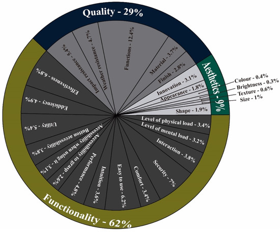 A circular graph was drawn, which showed the values together for better visualization of each of the attributes’ importance and weight during product usability evaluation. The percentages show the final weight of each attribute and sub-attribute (See Figure 5).