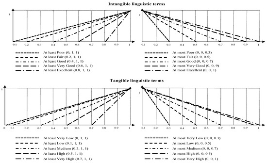 The fuzzy information axiom has been proposed by Kulak and Kahraman to solve multi-attribute decision-making problems that have linguistic information [19]. Fuzzy data can be fuzzy linguistic terms adapted to tangible and intangible attributes. For this, they are first transformed into fuzzy numbers, and then all fuzzy numbers are assigned a classification, which systematically converts the linguistic terms to their corresponding fuzzy numbers. The system contains five-story conversion scales, such as “poor-fair-good-very good-excellent” for intangible criteria and “very low-low-medium-high-very high” for tangible criteria [19,30]. The concept of fuzzy logic provides a logical framework to handle approximate reasoning and evaluate options effectively [31].