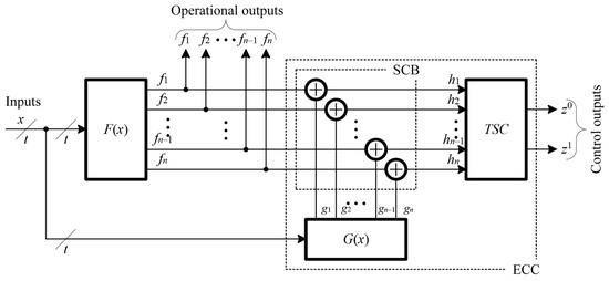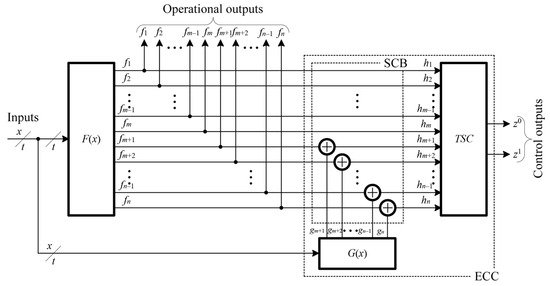 Figure 2 illustrates a standard configuration of the ECC for the F(x) device with the BSC method employed to a uniform block code that can be divided arbitrarily. In this case, the diagnostic object’s m outputs are not converted and are directly fed to the TSC inputs. The remaining k = n − m outputs’ values are adjusted in SCB before being sent to the TSC inputs. At the checker’s inputs, a code word from the (m, k) block code is formed, where m is the number of data symbols and k is the number of checking symbols.
