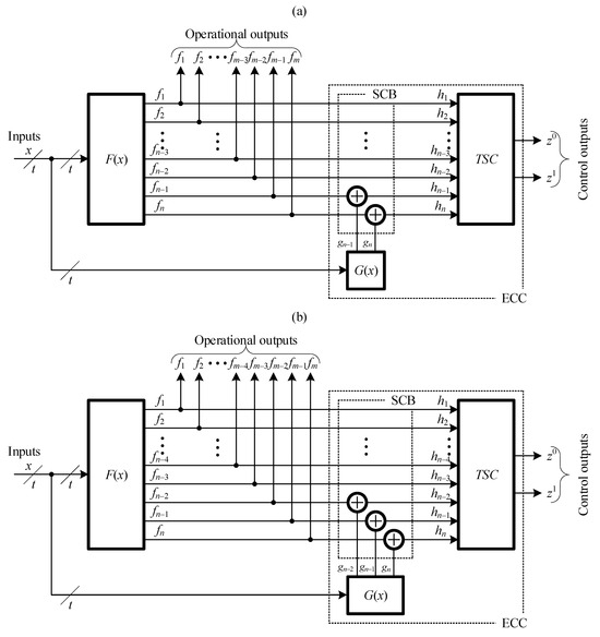 The authors thoroughly researched error detection through polynomial codes within the conventional ECC structure and investigated the impact of controlled device malfunctions on computing data symbol functions [26,29]. In fact, the error detection characteristics are known at those outputs of the structures appearing in Figure 3 that were not converted in SCB. This condition applies to the ECC organization.