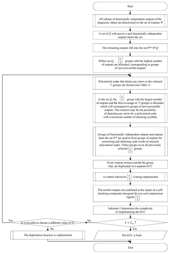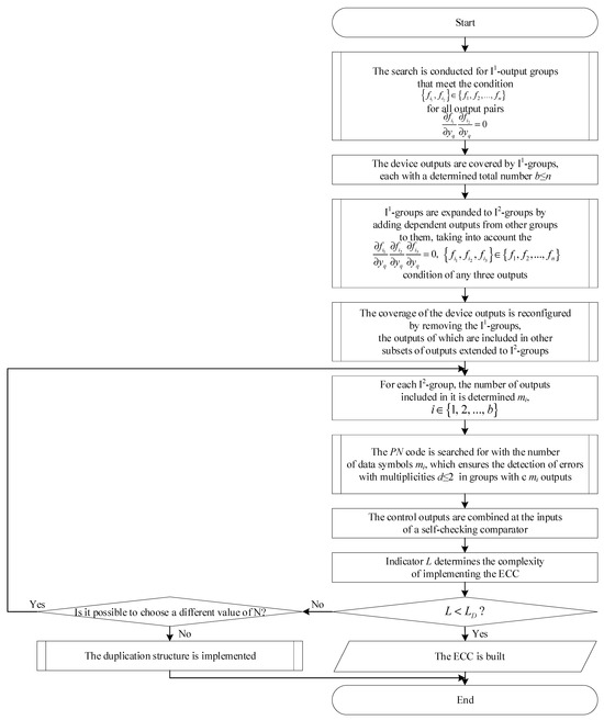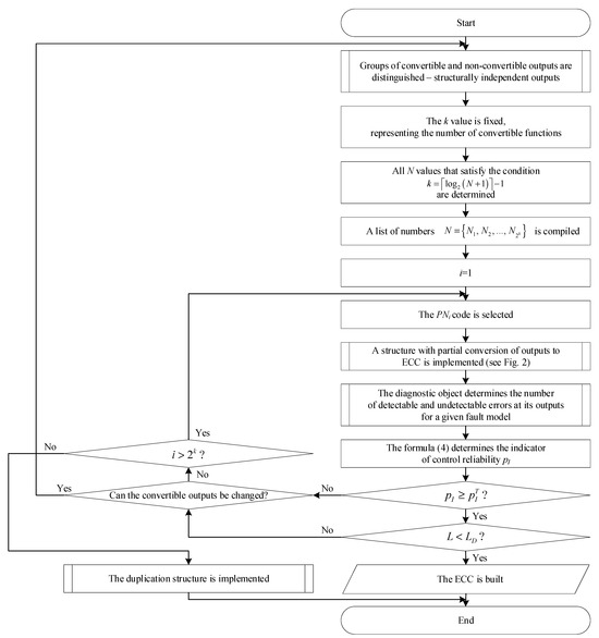If the specified indicator meets the requirements of the ECC designer, i.e., and if , the preset value of the reliability indicator, is in line with expectations, then proceed to the next step. The process involves determining the complexity indicator of the ECC implementation (denoted as L) and then comparing it with the complexity of the ECC implementation using the standard duplication method (denoted as LD). If ECC is constructed according to the proposed method. Otherwise, the system checks whether outputs can be replaced for conversion to ECC and selects the number N.