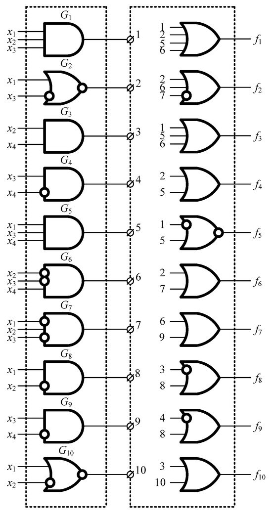 The structures of Formulas (1) and (2) are identical. Each formula shows the result of multiplying two Boolean expressions to the left. For the selected set of two or three outputs, the disjunction of Boolean derivatives is displayed in the first parentheses. The second parentheses display the disjunction of Boolean derivatives for the remaining outputs. The output of fi will only display an error resulting from a malfunction of element Gq, if . In this case, the Boolean derivative equals a specified Boolean function . For those input combinations where , the values at the output fi will be distorted. The error resulting from a malfunction of element Gq will manifest at the outputs fa and fb if and . . These outputs will be dependent in this scenario. In the event that any element malfunctions, only the outputs fa and fb will be distorted. According to definition 1, this group of outputs will be independent of the group of outputs . Therefore, there should not be any circumstances in which the Boolean derivative of any variable for any other output does not equal zero: . Then the expression is valid for all outputs from the group: . It follows that distortions may appear in either of the selected output groups, or , if . In this example, Q represents the collection of indices for q elements in the device’s structure.