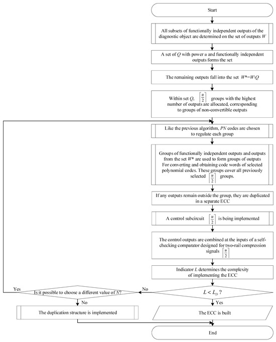 Observations of polynomial codes’ characteristics [26,29] show that increasing the number of data symbols results in twice as many undetectable errors, given a constant number of check symbols. Consequently, the number of undetectable errors increases in the outputs of controlled devices. To address this issue, it is recommended to control the outputs by groups. Figure 6 illustrates the algorithm for synthesizing ECC in this scenario.