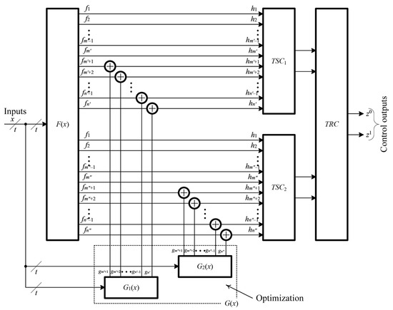 Figure 7 illustrates the ECC’s organizational structure with the allocation of two groups of controlled outputs by polynomial codes. For simplicity, the system’s operational outputs are not displayed. In this scenario, two independent control circuits are employed for each subgroup of outputs. This leads to the allocation of subsets of convertible and non-convertible outputs. It is important to note that only the groups of convertible and non-convertible outputs within each independently controlled group of outputs of the device F(x) should be independent. There are no other restrictions on outputs. In other words, there are two subgroups of convertible outputs and two subgroups of non-convertible outputs that may be dependent. All the ECC’s gates conform to standard specifications, with the exception of the control logic blocks G1(x) and G2(x), which are synthesized individually for each subgroup of outputs of the device F(x). It is possible to optimize and implement their joint uniform block G(x). The first group of outputs is controlled based on the selected polynomial code using the TSC1, while the second group of outputs is controlled based on another selected polynomial code using the TSC2. The results obtained from the checkers are merged via the TRC two-rail signal compression component. This component serves as both the diagnostic system’s outputs and the combined outputs of the checkers.