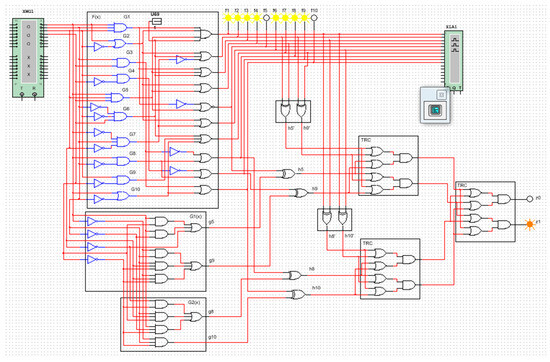 During the experiment, stuck-at faults, specifically stuck-at-0/1 (gate U69 in Figure 11), were sequentially installed at the outputs of gates whose paths are connected to three or more outputs of the diagnosed circuit. These gates are the logic gates of the first circuit level, namely G1, G2, G5, and G6. The system received a sequence of input vectors, and the resulting values of the output working vectors were recorded. If a single internal fault is transmitted to the outputs of the diagnosed circuit and distorts the bits of the output vector {f1, f2, …, f10}, the values of the vector {z0, z1} are analyzed. If the values of the vector bits {z0, z1} remain unchanged when the vector bits {f1, f2, …, f10} are distorted, it is considered that this ECC structure does not detect this malfunction. Otherwise, it does. This analysis investigates internal faults at the outputs of elements G1, G2, G5, and G6 for ECC structures based on the structures proposed by the authors.