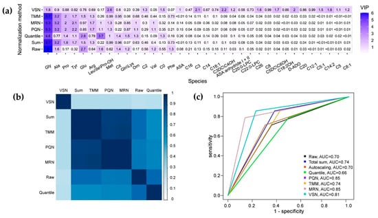 (a) A heatmap depicting the distribution of VIP from OPLS models based on each normalized dataset. (b) A plot illustrating the similarity in the variable importance projection (VIP) distributions of OPLS models based on different normalization methods. The score of similarity was calculated using the Tanimoto coefficient. (c) The receiver operation curves (ROC), obtained by validation of OPLS models based on normalized datasets.